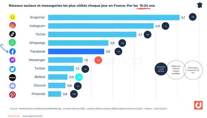Si votre cible est les 15-24 ans alors Facebook reste une valeur sure mais il faut aussi penser à aller vers d’autres horizons. Dans cette tranche d’age très clairement la tendance va vers Snapchat, Instagram et TikTok .