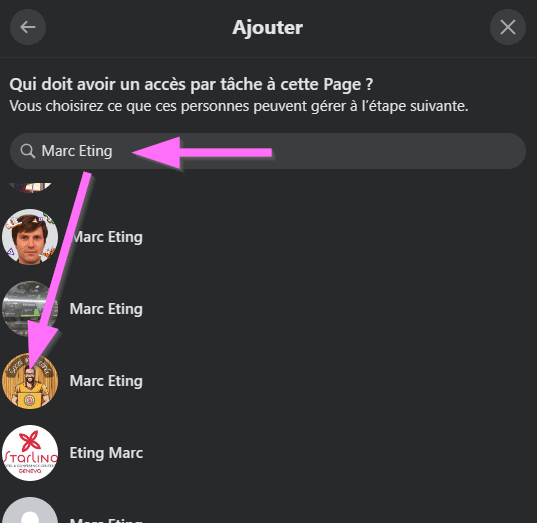 6 – Dans la nouvelle fenêtre mettez le nom de la personne et vérifiez que cela correspond a son image de profil : exemple ici un de nos collaborateurs « Marc Eting »