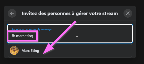 A cette étape il se peut que parfois , au contraire des autorisations, que cela ne fonctionne pas bien juste sur le nom de la personne donc entrez alors le nom du profil complet. Dans notre exemple ce ne sera pas « Marc Eting » mais « fb.marceting » qui est le lien de son profil dans la barre d’adresse Facebook.