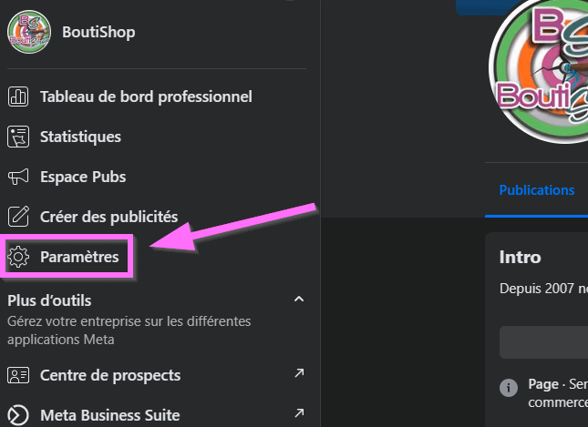 1 – Allez sur votre page puis cliquez sur « Paramètres » :