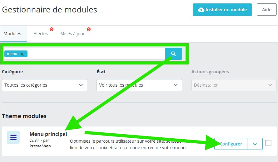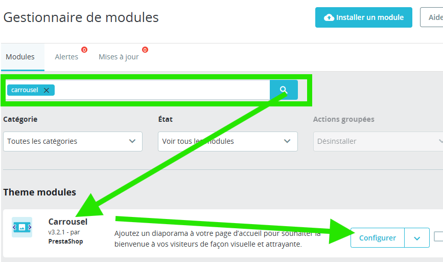 - Configuration : Pour chaque module installé, un bouton « Configurer » vous permet d’accéder à ses réglages spécifiques.