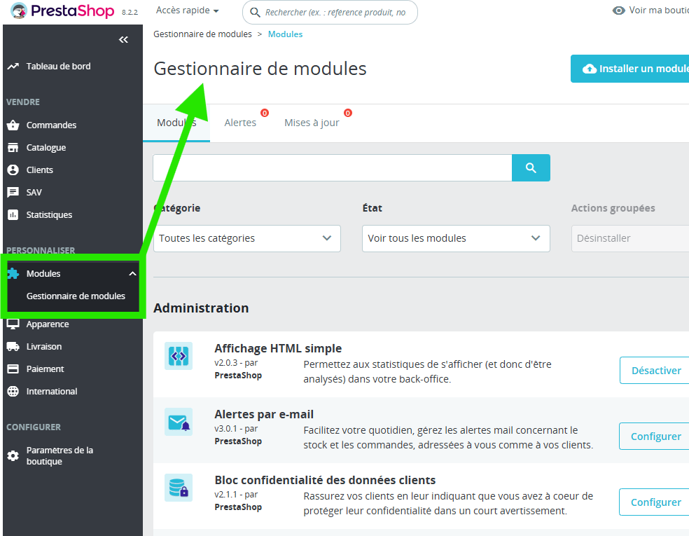 Le gestionnaire de modules est le cœur de votre boutique. Imaginez-le comme un App Store où vous pouvez installer, configurer et gérer des fonctionnalités pour étendre les capacités de votre site sans avoir à toucher une seule ligne de code. Que vous ayez besoin d’un nouveau moyen de paiement, d’une solution de livraison ou d’un outil marketing, tout se trouve ici.