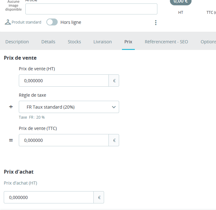 - Prix de vente (HT) : Saisissez le prix de votre produit hors taxes.