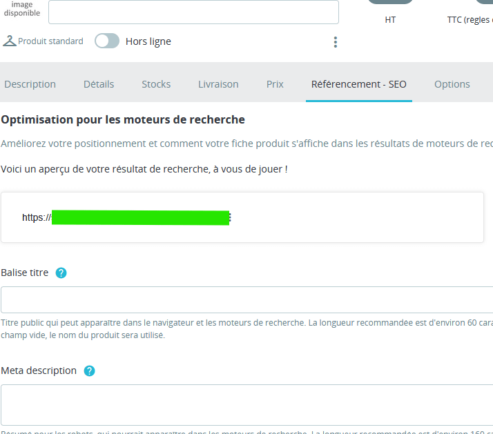 - URL simplifiée : L’URL simplifiée est l’adresse web de votre produit. PrestaShop la génère automatiquement à partir du nom du produit. L’objectif est d’avoir une adresse claire et lisible pour l’internaute et les moteurs de recherche.