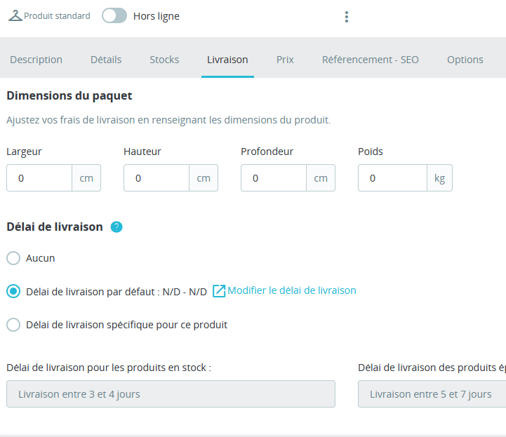 L’onglet Livraison vous permet de paramétrer les dimensions, le poids et les transporteurs associés à votre produit. Ces informations sont cruciales pour calculer les frais de port de manière précise.