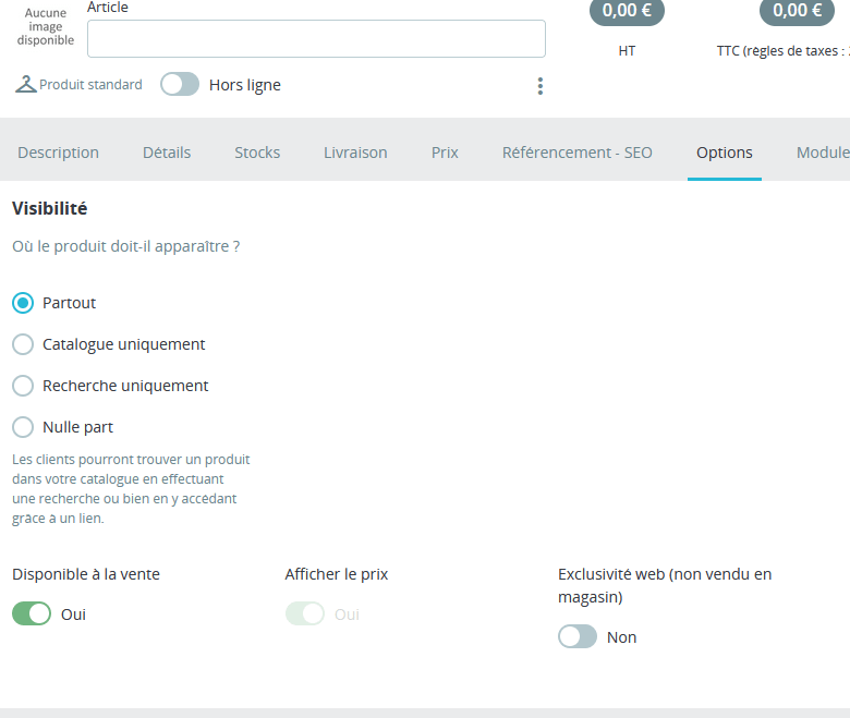 - Disponible à la vente : Si vous décochez cette option, le produit sera affiché sur le site, mais vos clients ne pourront pas l’acheter.