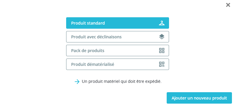 - Prenez quelques instants pour lire la brève description de chaque option : Produit standard, Pack de produits, Produit virtuel et Produit avec déclinaisons.