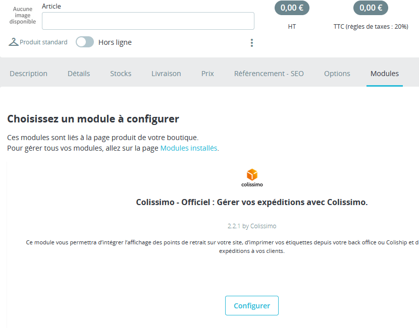 L’onglet Modules est un espace dynamique où vous pouvez ajouter des fonctionnalités spécifiques à votre fiche produit. Ces fonctionnalités proviennent de modules complémentaires que vous avez installés sur votre boutique.