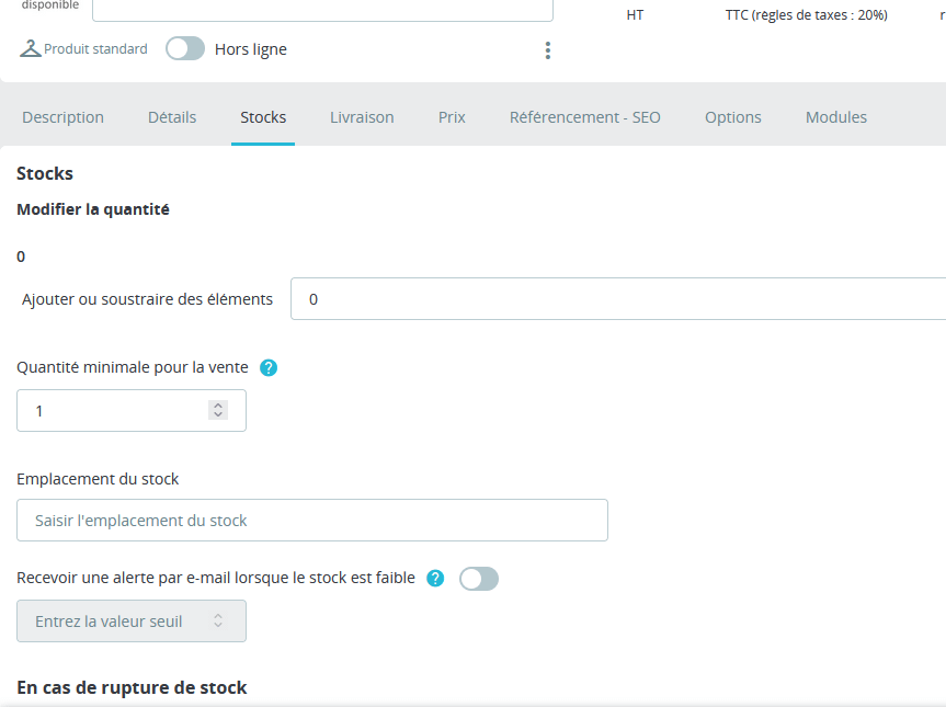 - Quantité en stock faible : C’est le niveau de stock où PrestaShop vous envoie une alerte par e-mail.