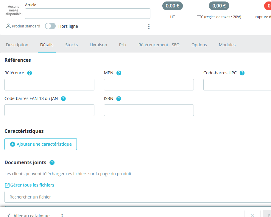 L’onglet « Détails » vous permet d’ajouter des informations techniques et logistiques essentielles pour la gestion de votre produit, de son stock à ses spécificités.
