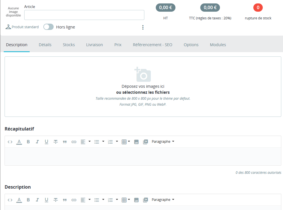 - Résumé (court) : Rédigez un résumé qui doit faire un maximum de 800 caractères. Ce texte s’affiche sur les pages de catégorie et donne un aperçu rapide du produit.