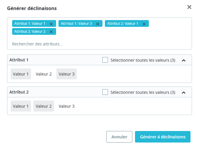 - Cliquez sur le bouton Générer les déclinaisons. Une fenêtre pop-up s’ouvrira pour vous permettre de choisir les attributs de votre produit.