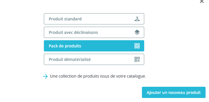 Le pack de produits est idéal pour proposer des kits, des ensembles ou des offres groupées à vos clients (par exemple, un pack « ordinateur + souris + housse »). Cela simplifie l’achat et vous permet de booster vos ventes.