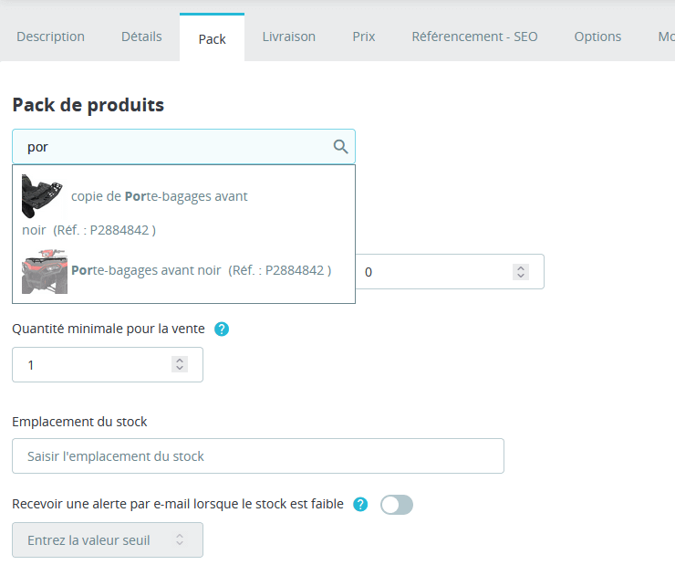 Le stock d’un pack est une particularité de PrestaShop. Il n’est pas géré manuellement, mais est directement lié à la disponibilité des produits qui le composent.