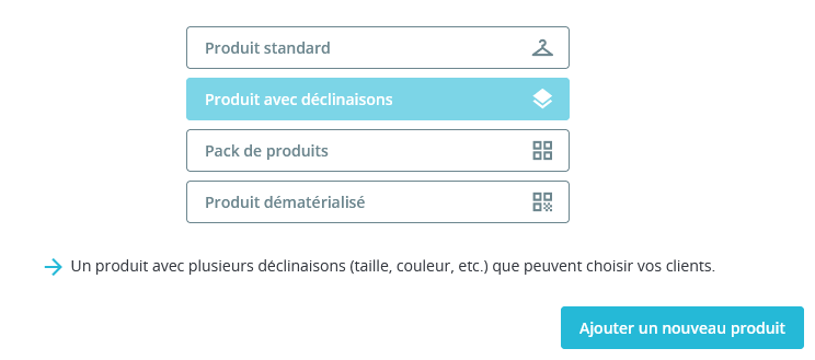 Le produit avec déclinaisons est l’option idéale si votre article existe en plusieurs versions (couleurs, tailles, matières, etc.). Au lieu de créer un produit pour chaque variante, vous gérez tout depuis une seule fiche produit, ce qui vous fait gagner beaucoup de temps.