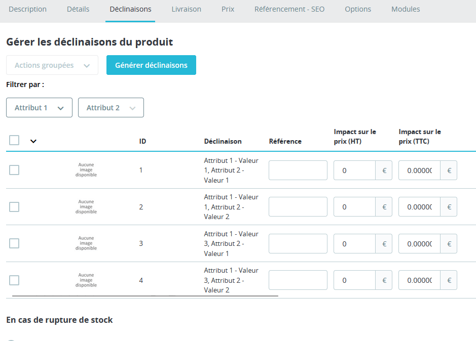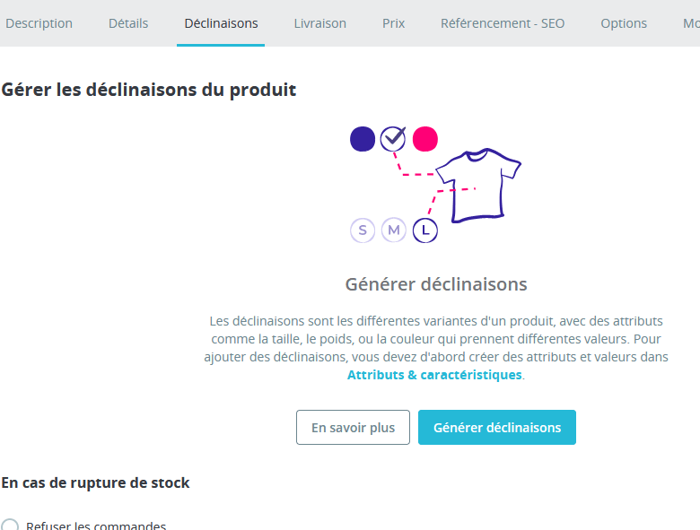 La gestion des ruptures de stock se fait au niveau de l’ensemble du produit (pas pour chaque déclinaison individuellement). Vous trouverez les options dans l’onglet Stock, juste au-dessus des déclinaisons.