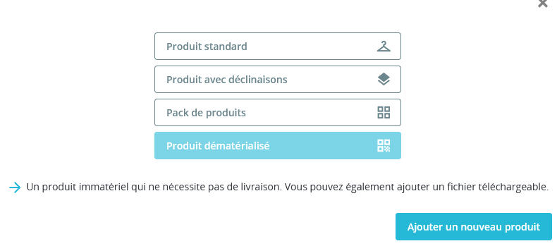 - En haut de la page, cliquez sur l’option « Produit dématérialisé ».