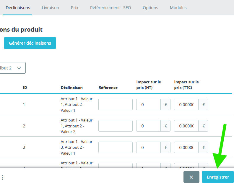 - PrestaShop va alors créer le tableau avec toutes les combinaisons possibles.