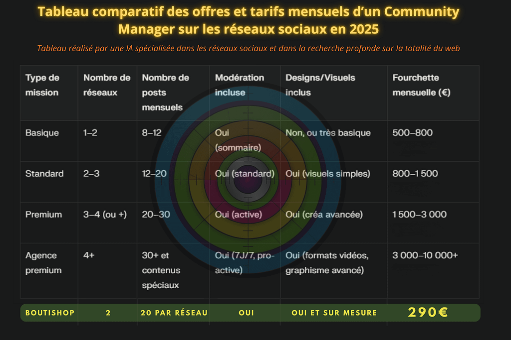 | Premium | Facebook & Instagram | 20 par réseau | Commentaires sur la page ✅ | ❌ (Option possible) | ✅ Inclus (sur mesure) | 290 € / mois |