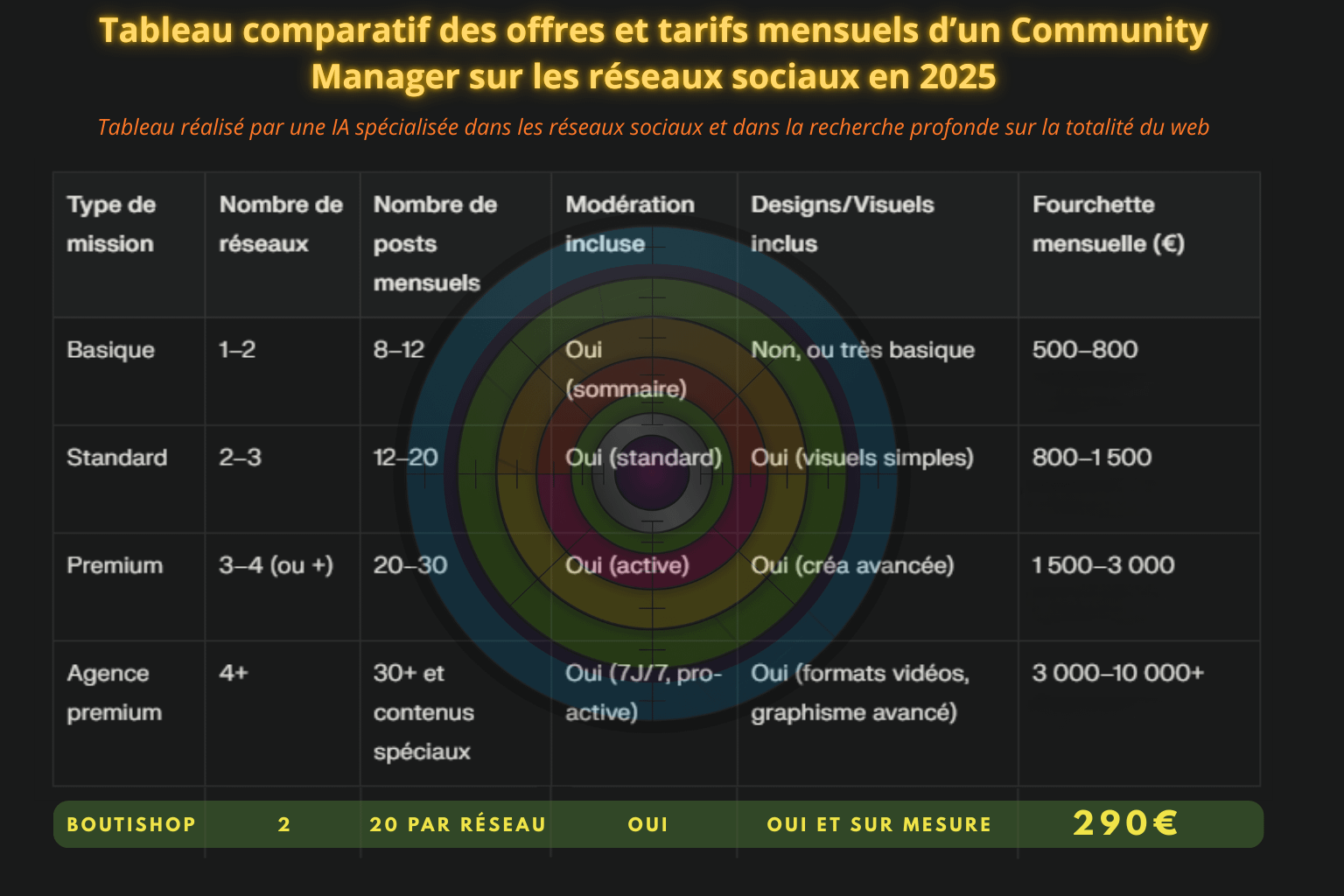 Premium | Facebook & Instagram | 20 par réseau | Commentaires sur la page ✅ | ❌ (Option possible) | ✅ Inclus (sur mesure) | 290 € / mois |